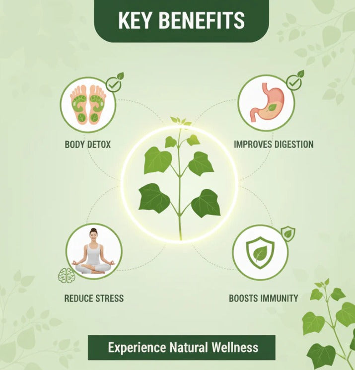 Harnesses the ancient healing power of Giloy (Tinospora Cordifolia), known in Ayurveda for its immune-boosting, anti-inflammatory, and detoxifying properties.